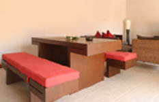 | Mobilier scandinave. | Fumoir et bibliothèque | Bain discret en "plein air". | Salon | |